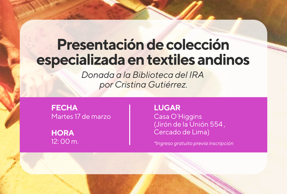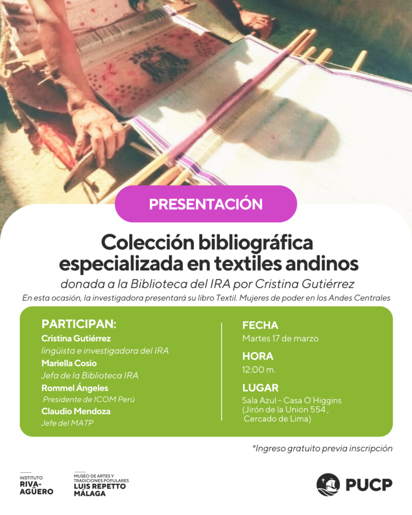 Los invitamos a la presentación de la colección bibliográfica especializada en textiles andinos, recientemente donada a la Biblioteca del IRA por la investigadora Cristina Gutiérrez, mediante una gestión del Museo de Artes y Tradiciones Populares “Luis Repetto Málaga” IRA-PUCP.