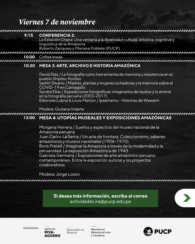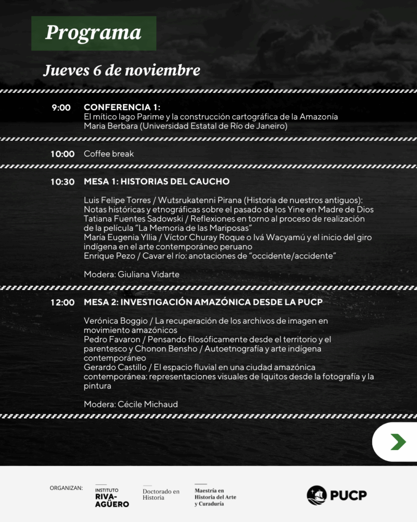 El 6 y 7 de noviembre, el Instituto Riva-Agüero, la Maestría en Historia del Arte PUCP y el Doctorado en Historia PUCP presentan la primera edición del seminario Historias Amazónicas, un espacio interdisciplinario que reúne a historiadores, artistas, cineastas y fotógrafos para reflexionar sobre las narrativas históricas y visuales de la Amazonía peruana.